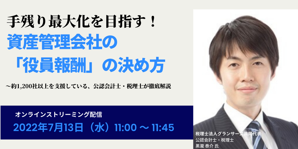 | 本コラムは、 2022年7月13日に開催されたセミナー『手残り最大化を目指す! 資産管理会社の「役員報酬」の決め方』(講師:税理士法人グランサーズ共同代表 公認会計士・税理士・黒瀧泰介氏)の冒頭5分を書き起こしたものです。 |