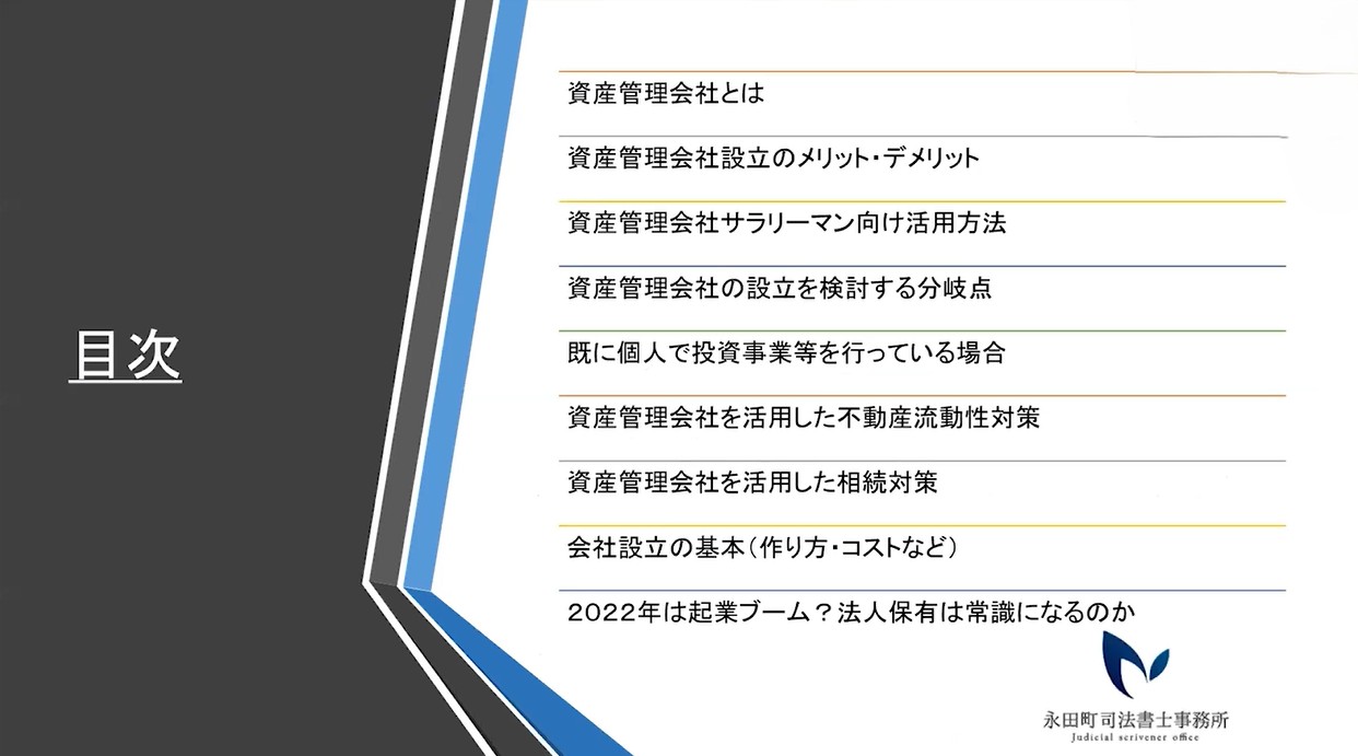加陽:本日は、資産管理会社とは何か、メリット・デメリットなどについて、皆さんに知っていただければと考えております。パワーポイントの目次に沿って、お話をしてまいります。