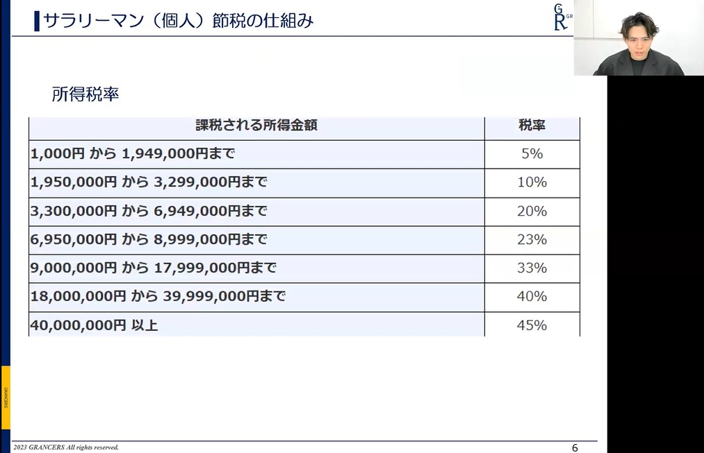 例えば、年収が500万円の人だったら、この表の中の上から3番目になるので、20%弱ぐらい税率がかかってくるということになるのですが、これが年収1億円とかになってくると、4000万円以上のところに該当してくるので、一番下の45%、もう半分近く税金が持ってかれるということになります。