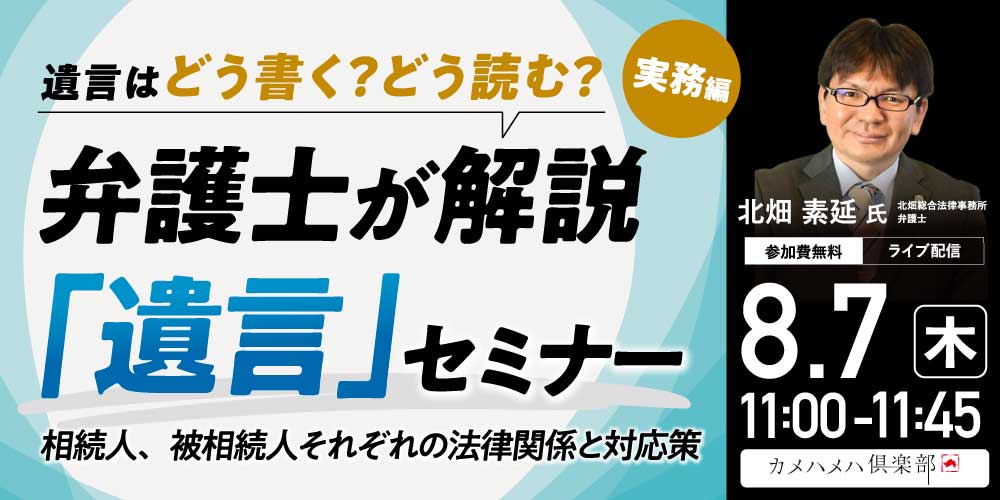 | 本コラムは、2025年8月7日に開催されたセミナー『遺言はどう書く?どう読む? 弁護士が解説する「遺言」セミナー<実務編>』(講師:北畑総合法律事務所弁護士・北畑素延氏)の冒頭5分を書き起こしたものです。 |