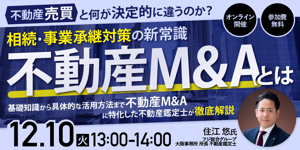 本コラムは、2024年12月10日に開催されたセミナー『不動産「売買」と何が決定的に違うのか?相続・事業承継対策の新常識「不動産M&A」とは』(講師:フジ総合グループ(フジ相続税理士法人/株式会社フジ総合鑑定)大阪事務所 所長 不動産鑑定士・住江悠氏)の冒頭5分を書き起こしたものです。