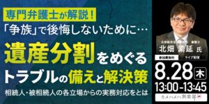 | 本コラムは、2025年8月28日に開催されたセミナー『専門弁護士が解説!「争族」で後悔しないために…遺産分割をめぐるトラブルの”備え”と”解決策” 』(講師:北畑総合法律事務所 弁護士・北畑素延氏)の冒頭5分を書き起こしたものです。 |