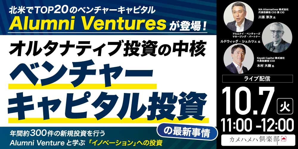 | 本コラムは、2025年10月7日に開催されたセミナー『北米でTOP 20のベンチャーキャピタル「Alumni Ventures」が登場!オルタナティブ投資の中核「ベンチャーキャピタル投資」の最新事情』(講師:MA Alternatives株式会社 代表取締役CEO兼CIO 川原淳次氏/アルムナイ・ベンチャーズ(Alumni Ventures) マネージング・パートナー ルドウィッグ・シュルツェ氏/Keyaki Capital株式会社 代表取締役CEO 木村大樹氏)の冒頭5分を書き起こしたものです。 |