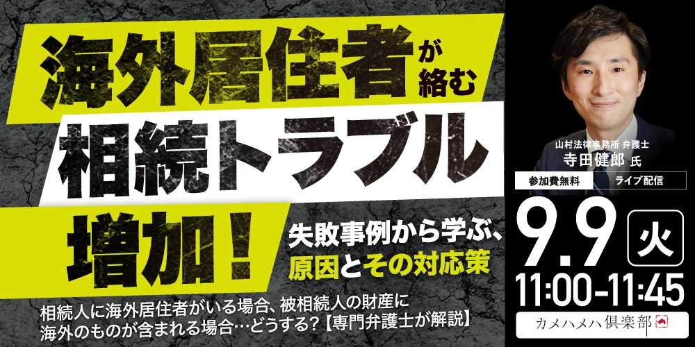 | 本コラムは、2025年8月1日に開催されたセミナー『「海外居住者」が絡む「相続トラブル」増加! 失敗事例から学ぶ、原因とその対応策』(講師:山村法律事務所 弁護士・寺田健郎氏)の冒頭5分を書き起こしたものです。 |