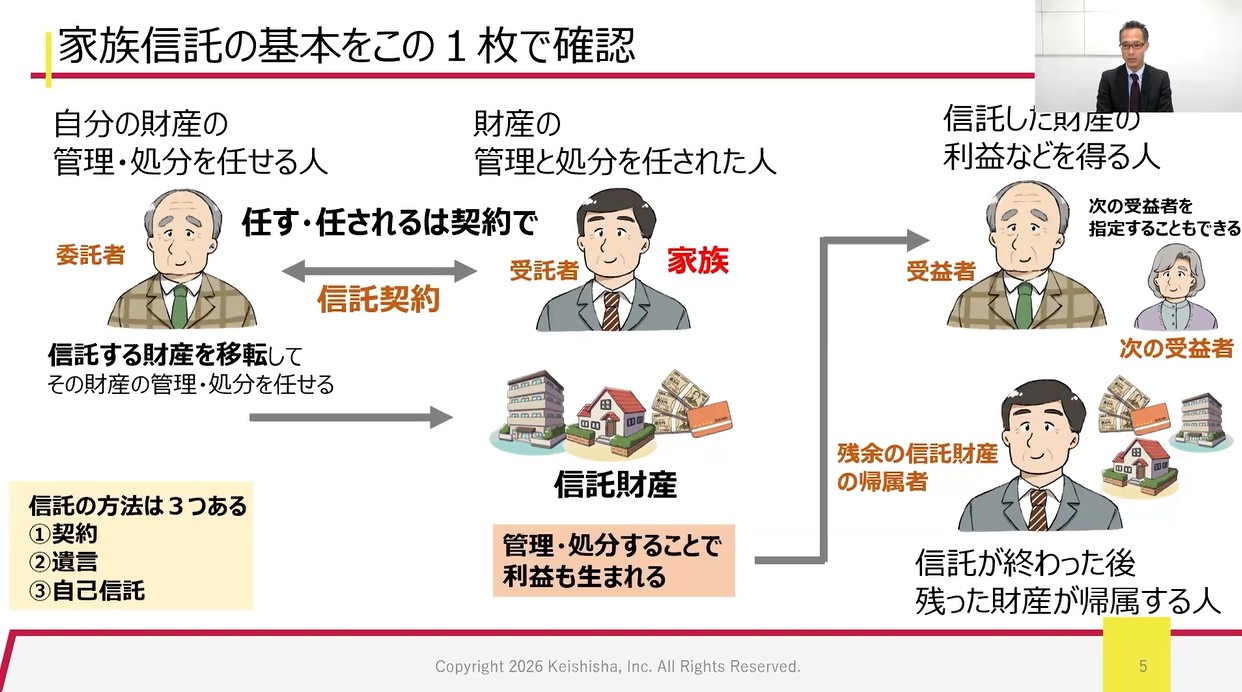 さらには信託の仕組みを使って、遺言では1世代、次の世代にしか渡せないんですけども。その先、さらに先という形で渡していくことができるので、財産の管理・処分と承継ができる信託ならではで実現できるということもあります。そういう形で活用が広がってきているといったところがあるかと思います。